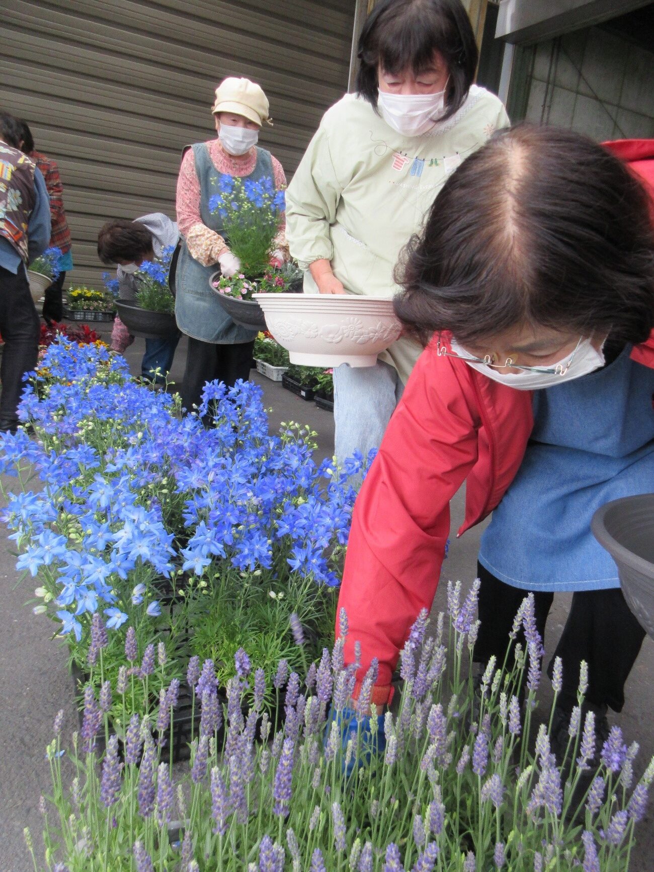 渋谷フラワー(大崎市鹿島台)から渋谷文栄さんを講師に迎え、ロベリア、マリーゴールド、ペンタス、カスミソウなど全19種類の中から、8種類を選んで思い思いに寄せ植えしました。