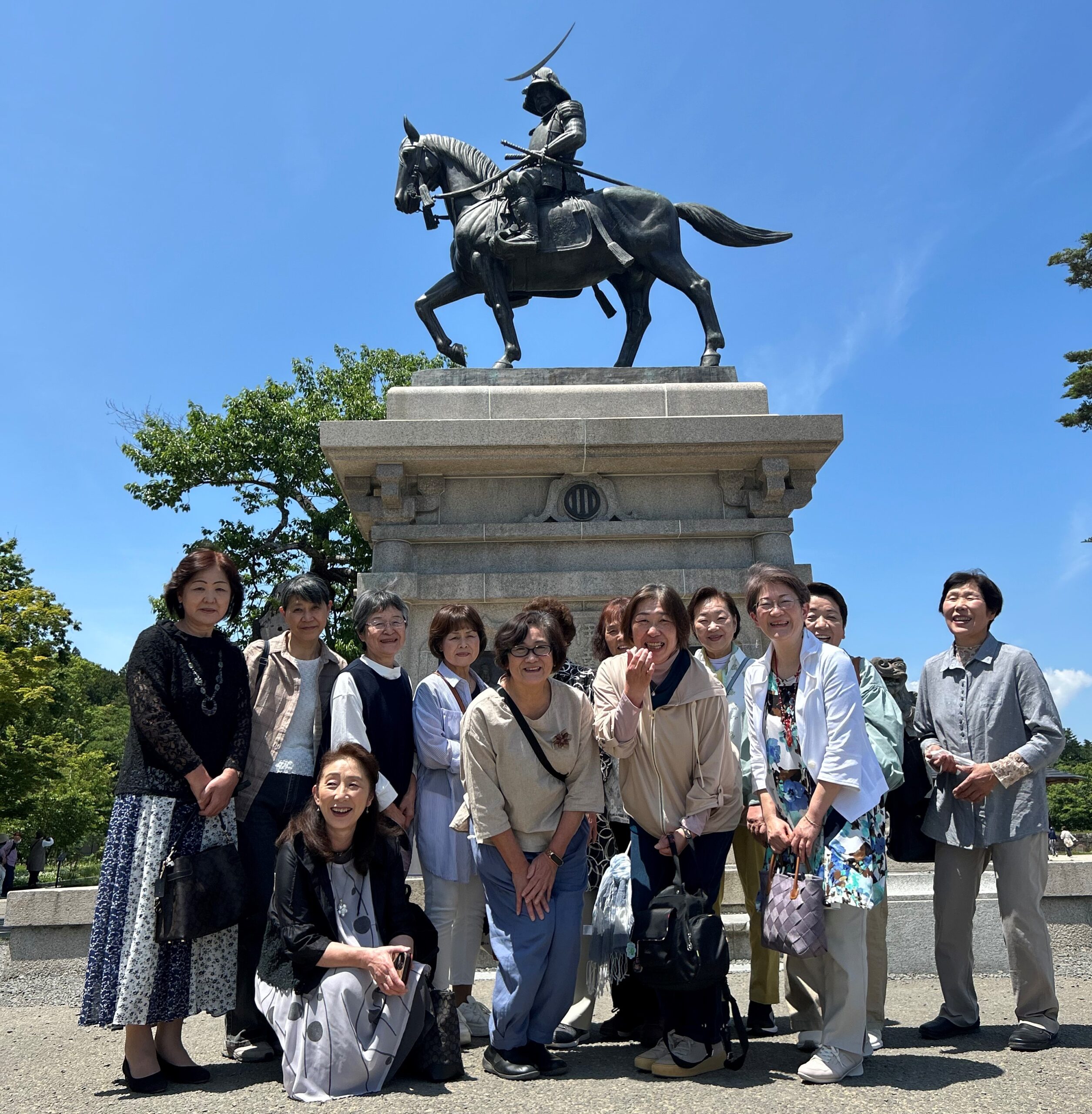 伊達政宗公の騎馬像の前で記念撮影する支部役員の皆さん