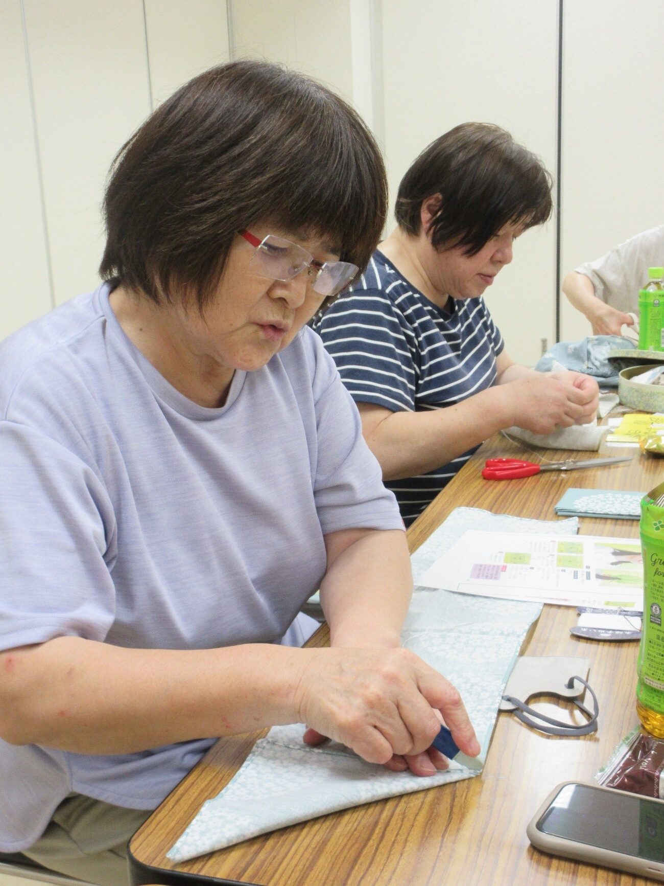 『家の光』記事活用グループ「ハナミズキ」は6月24日、鹿島台支店で「手ぬぐいかぶりん帽」作りに挑戦しました。会員5人が参加。 この作品は、『家の光』2025年5月号の付録「いま、よみがえる『家の光』台所の知恵ベストセレクション」に掲載されています。参加者は、慣れた手つきで作業を進め、35分ほどで完成させました。