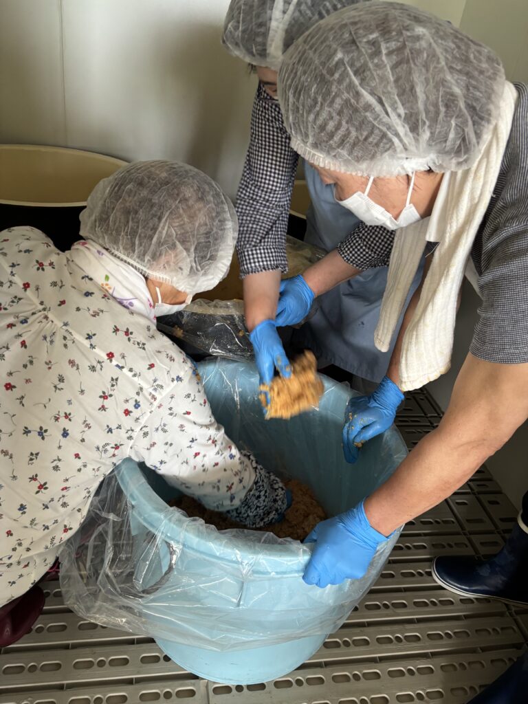 みどりのヘルプふれ愛グループ協議会田尻支部「まごころの会」は7月10日、ボランティアみその天地返しを行いました。 みそは今年3月、会員が地場産の米や大豆を使って仕込んだもので、11月に地域の高齢者へ無償配布を予定しています。会員は「今年も良いみそになりますように」と願いを込めながら、4斗たる3つ分のみそを手作業で天地返ししました。