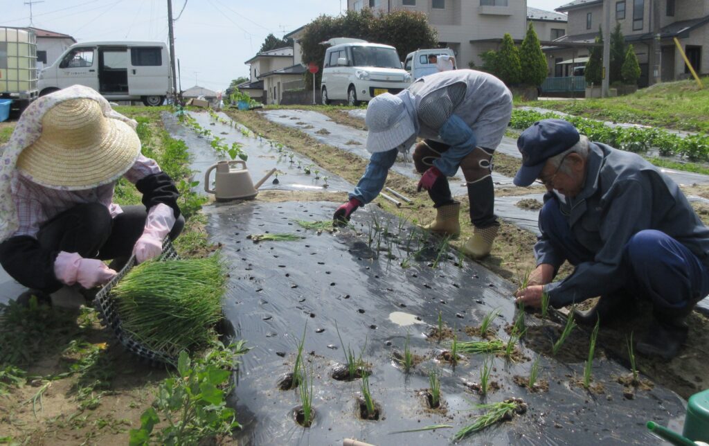 鹿島台支店は6月6日、大崎市鹿島台平渡のほ場で野菜づくり体験塾を開き、フードコーディネーターの一條忠子さんを講師に、青ネギの定植と除草作業を行いました。 塾生2人が参加。厳しい暑さの中、こまめに水分補給をしながら行いました。参加した塾生は「去年は福祉センターに収穫した野菜をおすそわけできた。今年もたくさん収穫できたらいいな」と声を弾ませました。