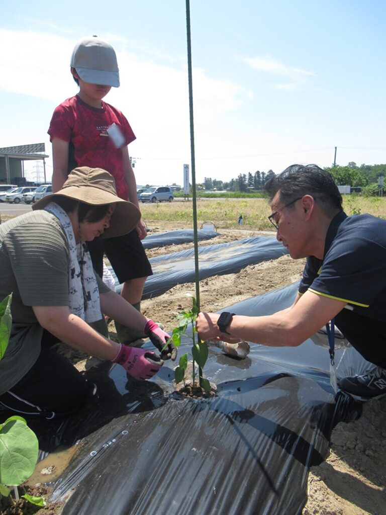 地域住民21人が参加。参加世帯ごとにうねを準備し、収穫まで管理します。開校式では参加者とスタッフが自己紹介を行ったほか、ほ場に移動し、職員とみどりの青年部田尻支部の盟友を講師に、マルチ張りや野菜苗の定植を行いました。ジャガイモやピーマン、ナスなど6種類を定植。参加者は「どれくらい株間をあけたらいいの」などと質問し、熱心に作業しました。