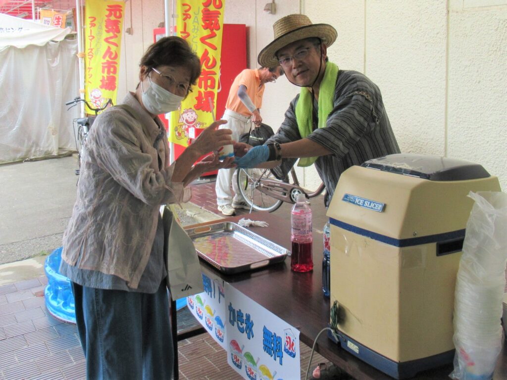 かき氷を受け取る来店者(左)