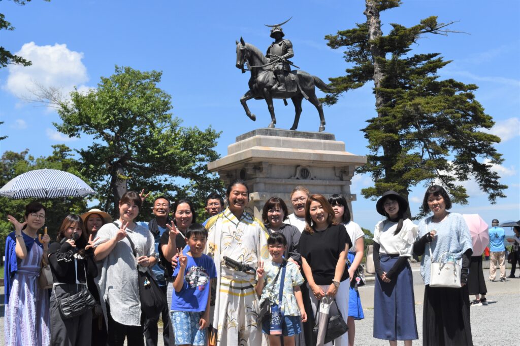 伊達政宗公の騎馬像の前で記念撮影する会員と会員家族の皆さん