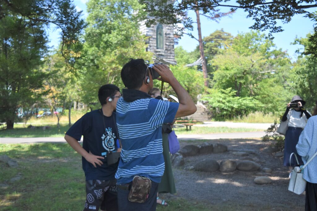 青葉城資料展示館ではVR(バーチャルリアリティー)を体験し、専用のスコープを使って仙台城本丸跡の散策を楽しみました。昼食後は、伊達政宗公の騎馬像や宮城県護國神社などを自由に見学ながら交流を楽しんだほか、劇団四季によるミュージカル「キャッツ」を観劇し、楽しい時間を過ごしました。