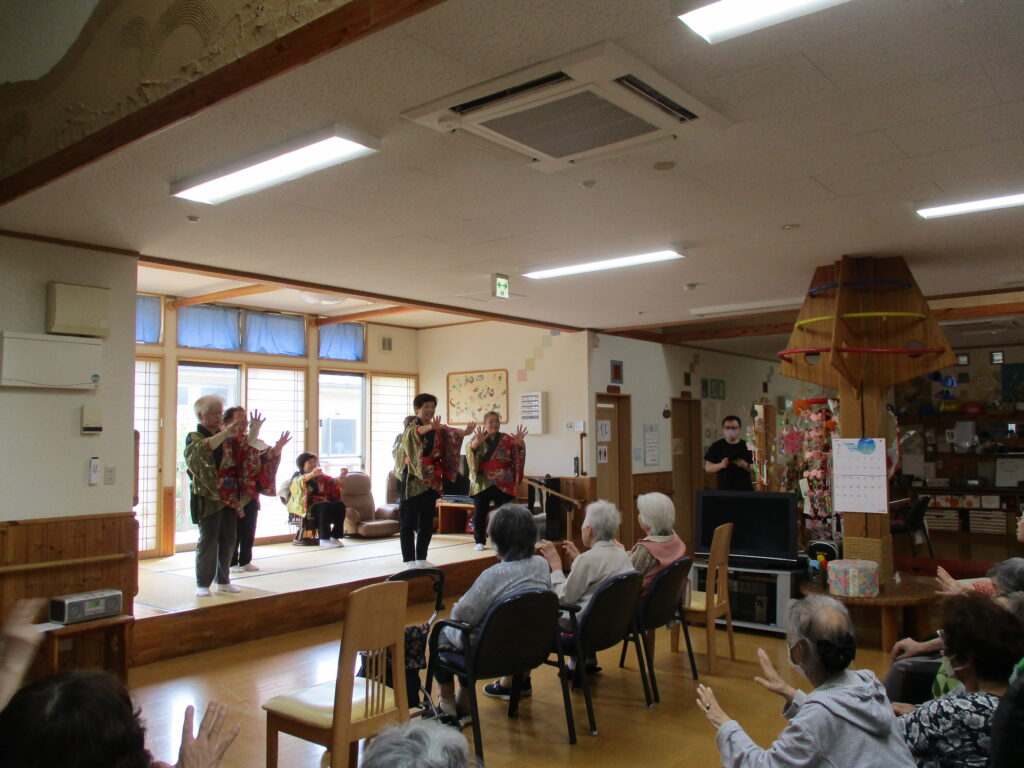 みどりのヘルプふれ愛グループ松山支部「ポピーの会」の会員7人は7月16日、大崎市松山のグループホームコスモスを訪問し、歌やダンスを披露して施設利用者と交流しました。 同会の遠藤敬子会長は「施設を訪問してのボランティア活動は久しぶり。指あそびなどで利用者の方と交流し、笑顔で楽しんでもらえてよかった」と話しました。