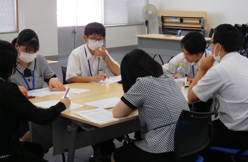 2年目職員の研修で、1年目の振り返りについて話し合う職員