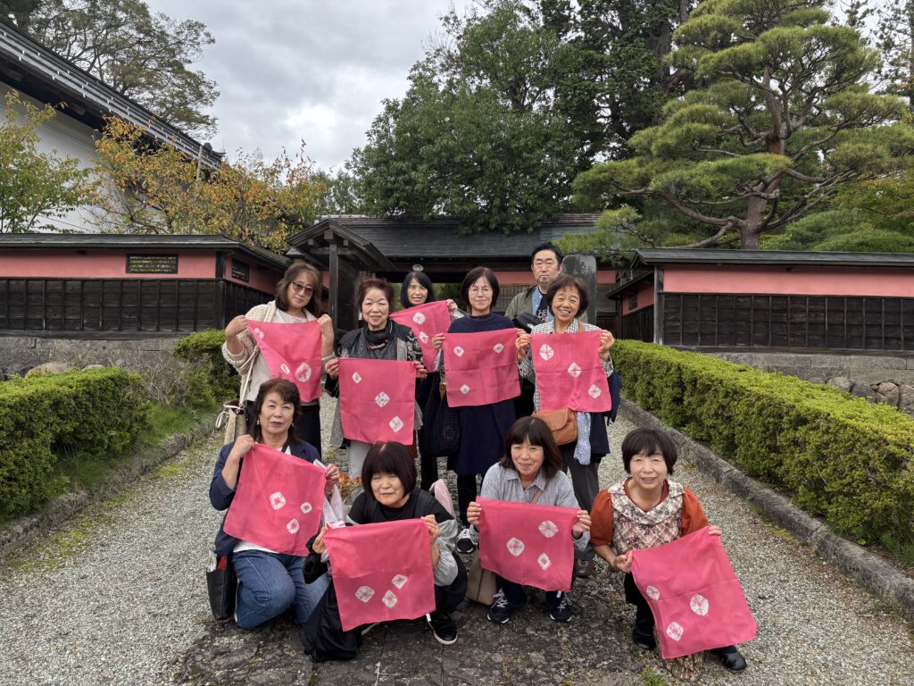 会員8人が参加し、山形県河北町の紅花資料館で紅花染めを体験。鮮やかに赤く染まった生地をお互い見せ合い楽しんだほか、資料館に展示された多くの時代雛や紅染衣装をじっくり鑑賞し、地域の歴史と文化について理解を深めました。