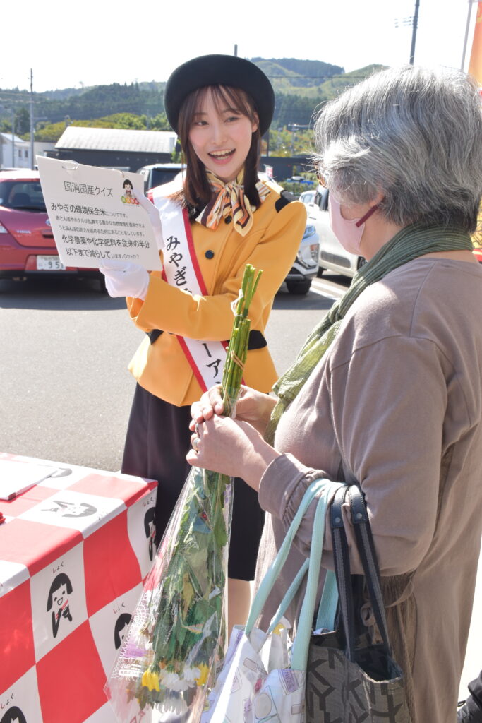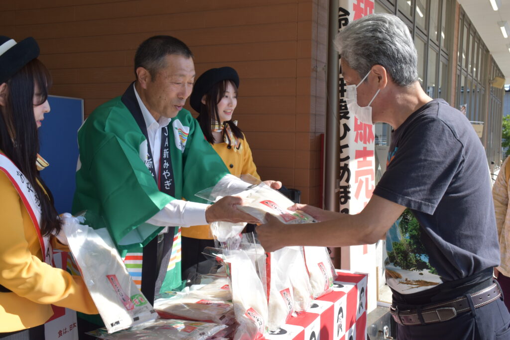 午前10時の開店と同時に、JA新みやぎの小野寺克己組合長が先着150人の来店客に「みやぎの環境保全米ひとめぼれ」の新米1㌔を手渡したほか、「国消国産クイズ」を開催し、正解者には新米1㌔を、その他の回答者には「ハローキティ」とJAグループのキャラクター「笑味(えみ)ちゃん」をデザインしたクリアファイルを贈りました。