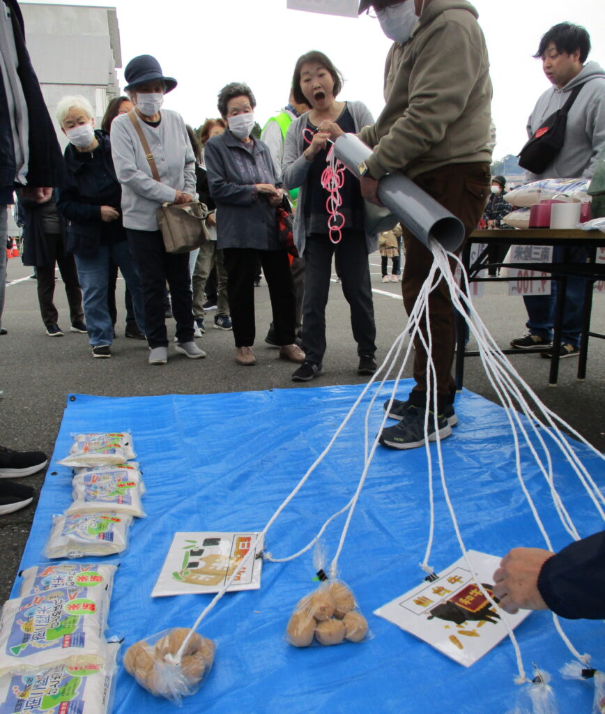 「ひっぱりくん」でくじを引く来場者