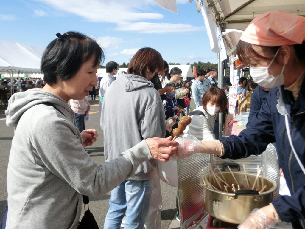 大郷支店は11月2日、大郷町が開いた「第8回おおさと秋まつり」に出店し、玉こんにゃくとジュースを販売しました。購入者からは「100円はリーズナブル。とてもおいしかった」と好評でした。