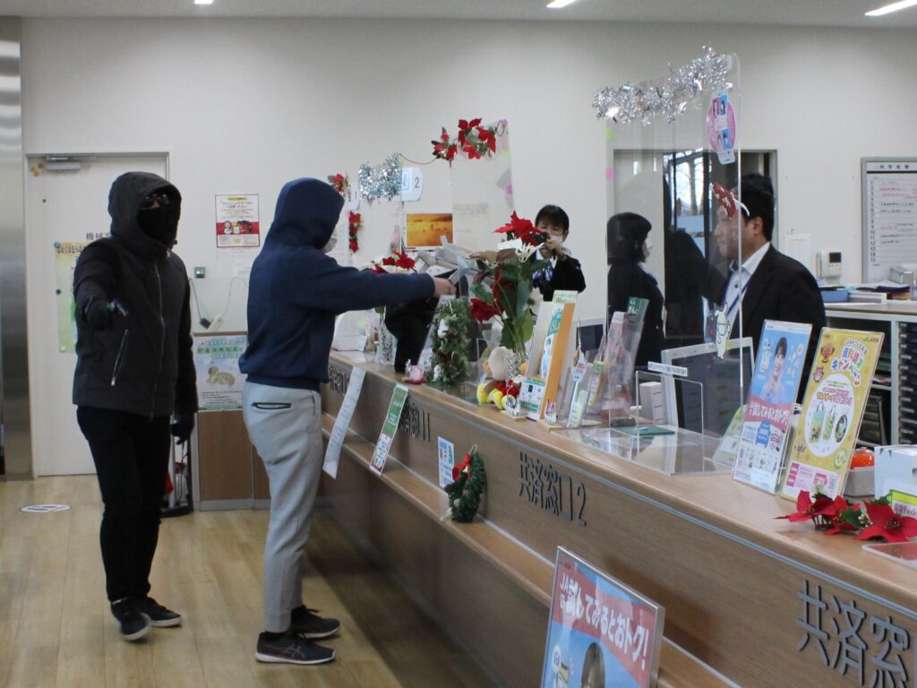 JA新みやぎ志津川支店は12月9日、同支店に拳銃を持った強盗が侵入し発砲、金銭の要求を想定した防犯訓練を行いました。