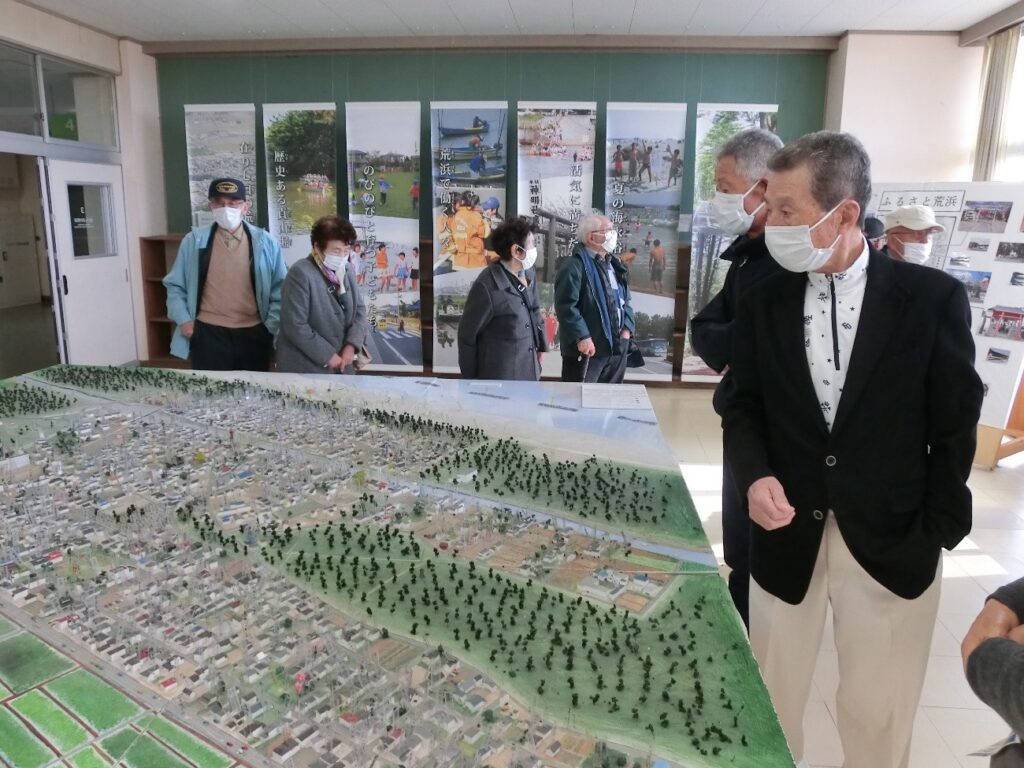 震災遺構仙台市立荒浜小学校の展示に見入る参加者