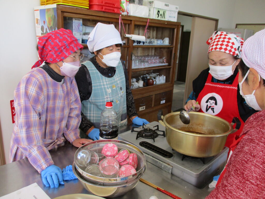 南三陸女性部本吉支部は11月12日、部員からの要望により志津川支店の職員を講師に焼き肉のたれ作りを行い、15人が参加しました。 たれを入れる瓶を煮沸消毒したほか、材料をすりおろして調味料と一緒にじっくり煮込みました。「もう少し甘みが欲しいな~」「ちょうどいい味になった」と自分好みの味に仕上げて完成させました。