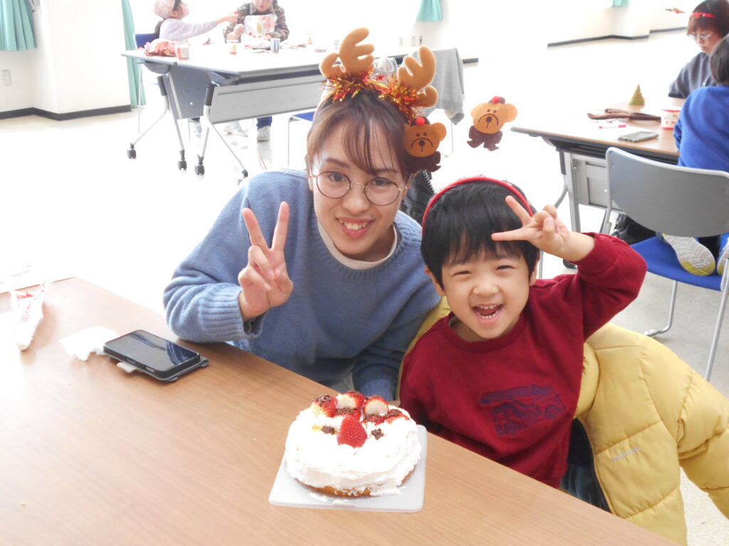 スポンジを焼いている間には、巨大ジェンガなどのレクリエーションで盛り上がりました。その後、焼き上がったスポンジに栗原市産のイチゴを乗せ、サンタの顔をデコレーションしました。