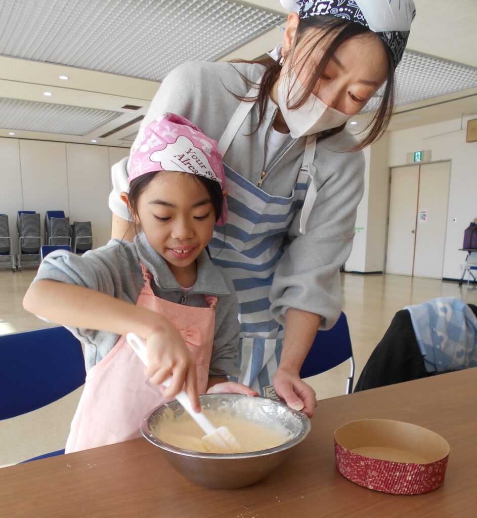 子どもたちは保護者と協力し、ボールに卵を割り、卵と砂糖をハンドミキサーで混ぜ、スポンジ作りを楽しみました。