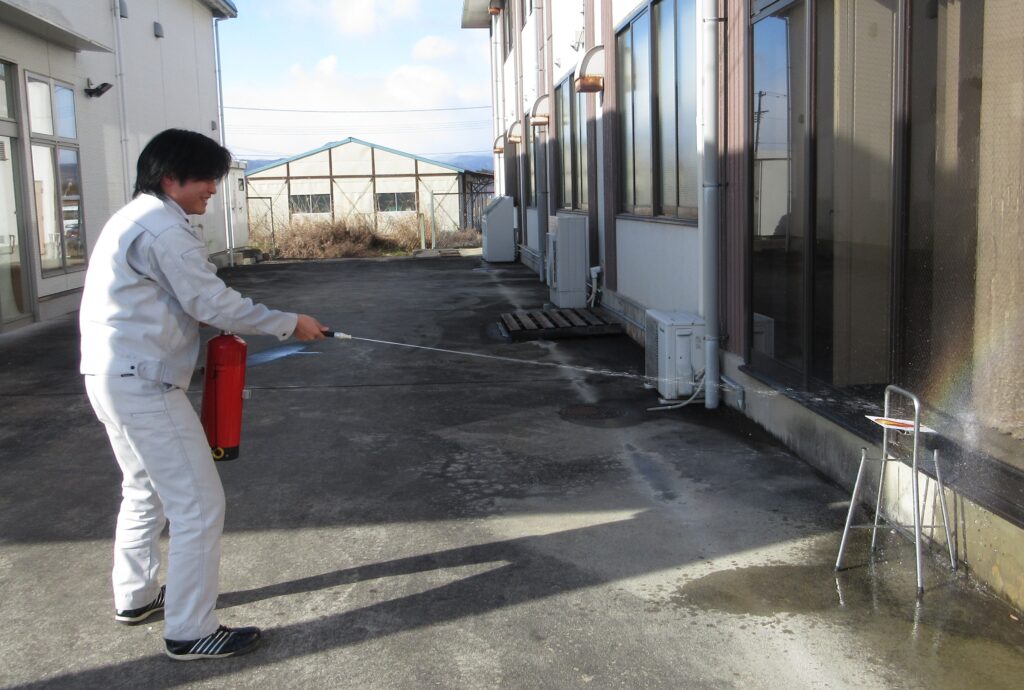 栗駒営農センターは12月26日、職員の防災意識の向上と消火器の使用方法を再確認するため、職員6人が消防訓練を行いました。 給湯室からの出火を想定し、火事の発生を周囲に知らせる役割と、消火器で初期消火を行う役割を交代で訓練。火に見立てた的に向けて水消火器を噴射し、参加者全員で初期消火を体験しました。 参加した職員は、「消火器の使い方を確認することで、防災意識が高まった。乾燥する時期なので、火の元の取り扱いには注意するよう心掛けたい」と話しました。