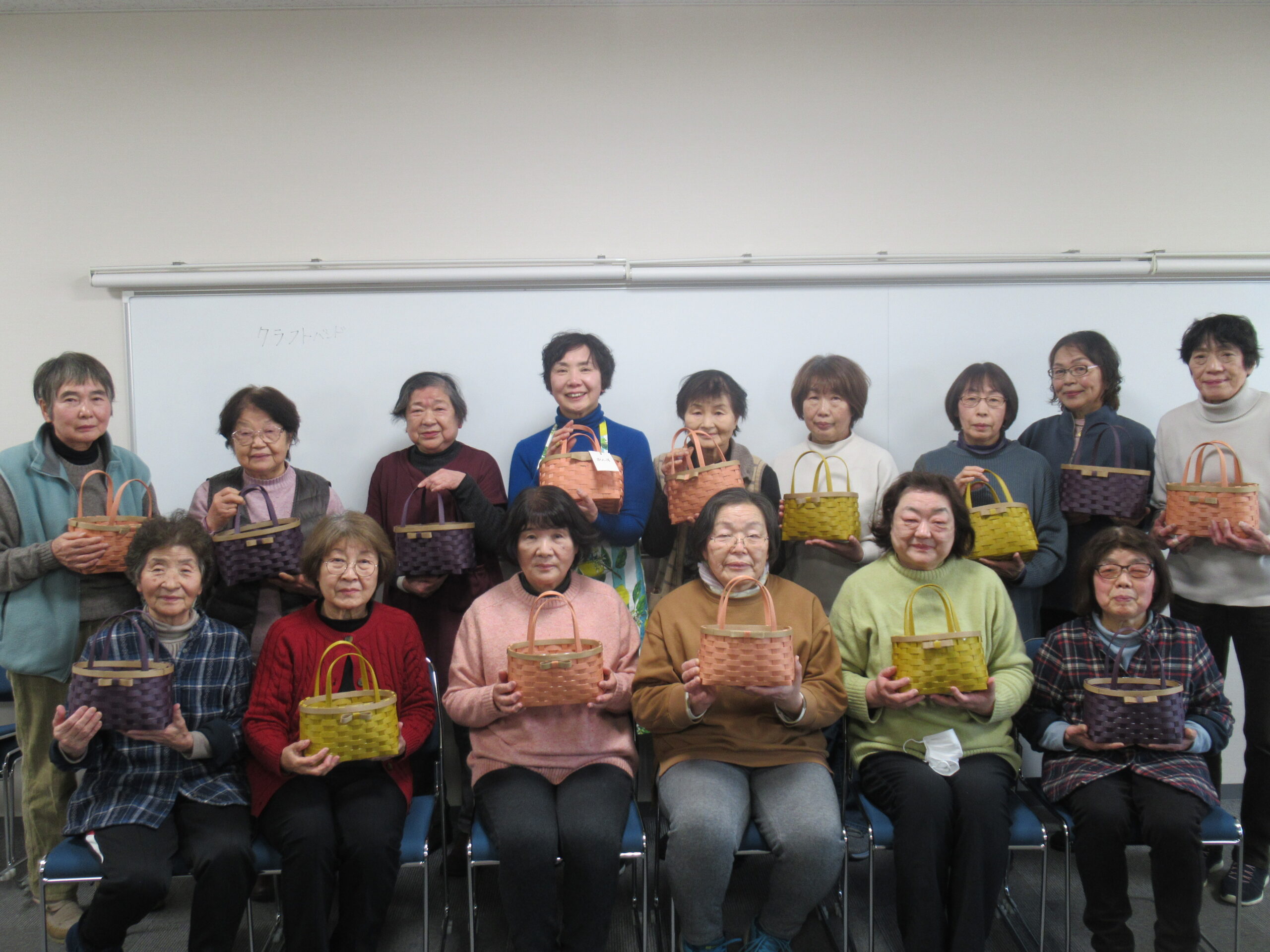 たかのDIYスタジオのたかのひろみ先生を講師に迎え、クラフトバンドを使った「クラフトバンドバック」作りに挑戦。参加者は、クラフトバンドを前後交互に編みました。必要な箇所はボンドでとめ、縁や持ち手も丁寧に仕上げ、アクセントにリボンをつけて完成です。クラフトバンドの硬さや継ぎ目の難しさに苦労しつつも、部員同士で教え合いながら楽しく作業しました。「夢中で作成した」「お出かけに持っていきたい」との声もあり、完成した作品は2月開催の「JA新みやぎ小牛田地域文化祭」に展示する予定です。