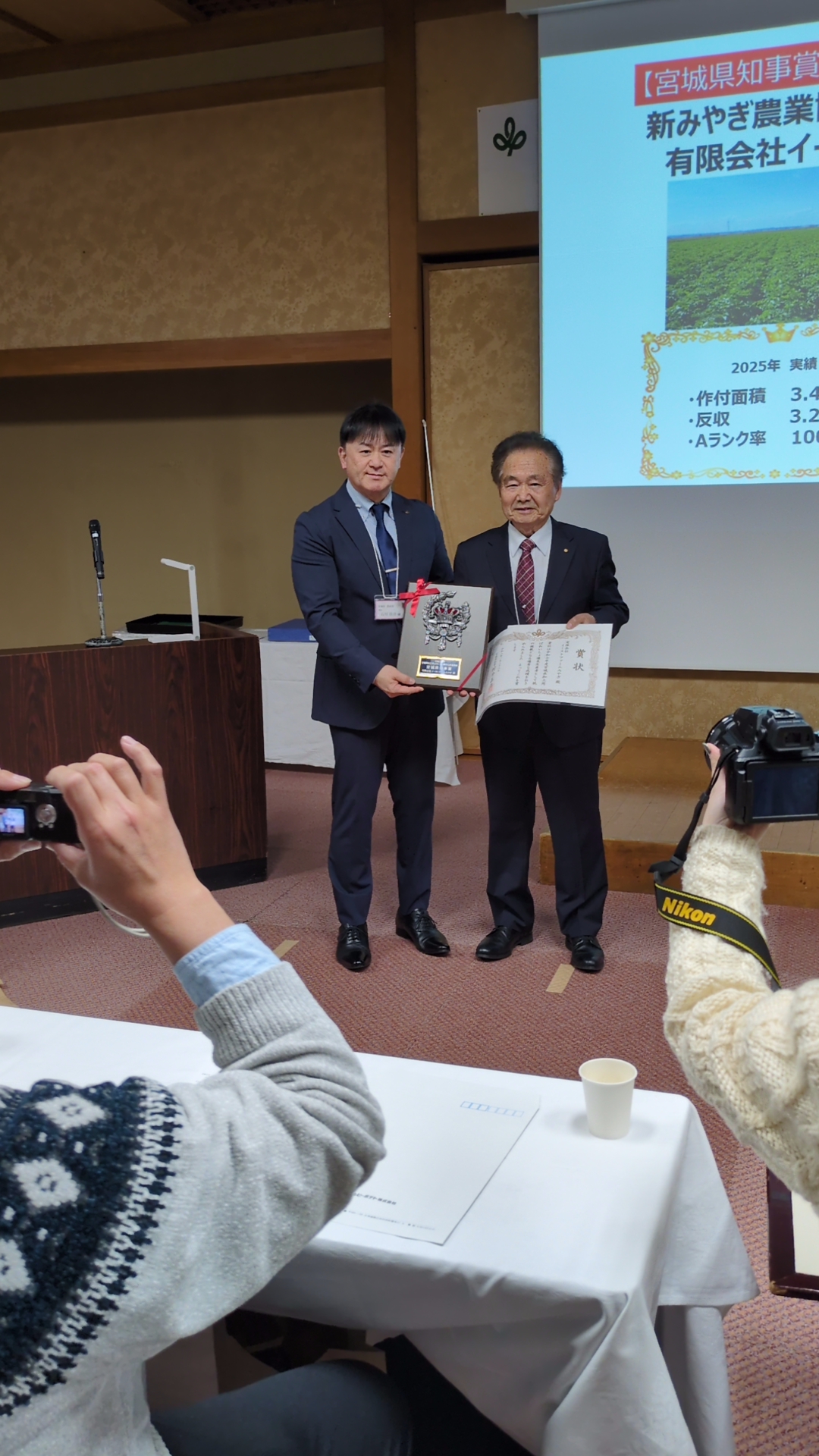 1月28日、仙台市太白区で「宮城県ぽてと生産者大会」が開催され、南郷営農センター管内の(有)イーストファームみやぎが、収量3.27tおよび品質Aランク100%の実績で宮城県知事賞を受賞しました。 関係機関を含め75人が出席。北海道の常山農場・常山浩伸代表による先進地講演も行われ、干ばつ時のかん水や輪作体系、種芋のジベレリン処理など収量向上の技術を紹介しました。 今後の栽培に向けて有意義な情報共有の場となりました。