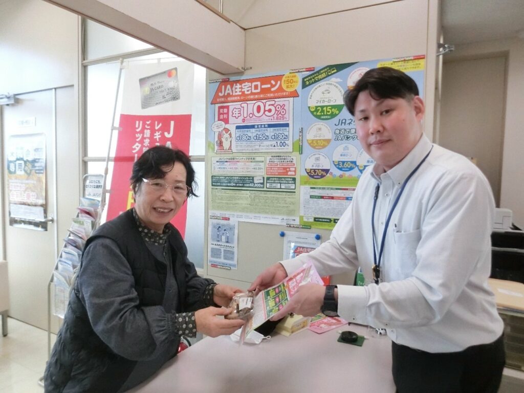 大郷支店は1月13日、来店感謝デーを開催し、来店者に日頃の感謝を伝えました。 窓口利用者先着50人に、大和町の七ツ森菌床椎茸生産組合で栽培されたシイタケをプレゼントし、地産地消をPRしました。受け取った来店者は「うれしい。おいしそう」と笑顔を見せました。