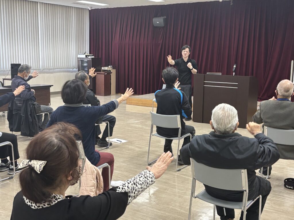 たいわ中央整骨院(大和町)の澁谷亮介院長を講師に「いつまでも自由な体でいよう!!ラクラク貯筋(ちょきん)教室」と題し、転倒防止に効果がある脳トレ体操や座ってできる筋力トレーニングで体をほぐしました。