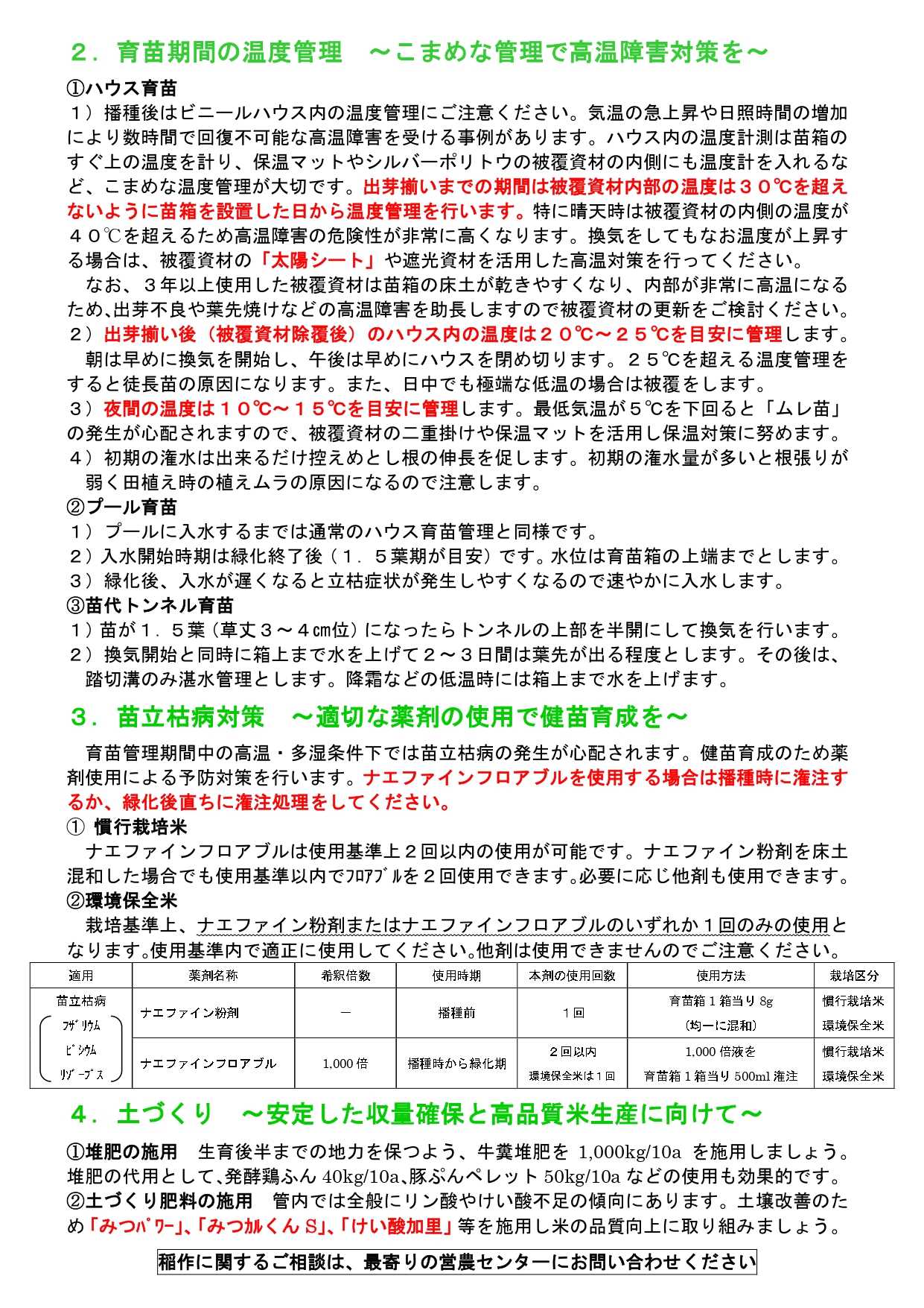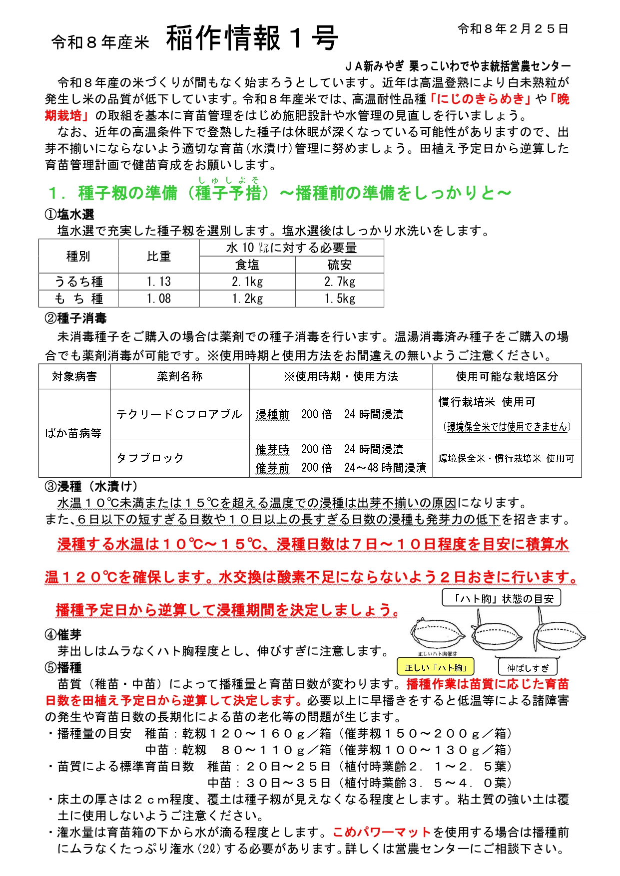 稲作情報1号〔種子予措・温度管理・苗立枯病対策・土づくり〕