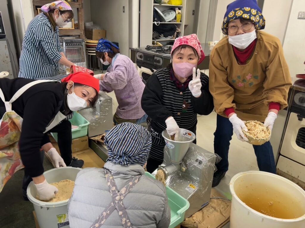参加者は声を掛け合いながら協力して取り組み、減塩の塩「厚生塩」を混合した「塩切り米麴」と蒸した大豆を混ぜ合わせ、みそすり機でミンチ状に加工してたるに詰め、みそを仕込みました。