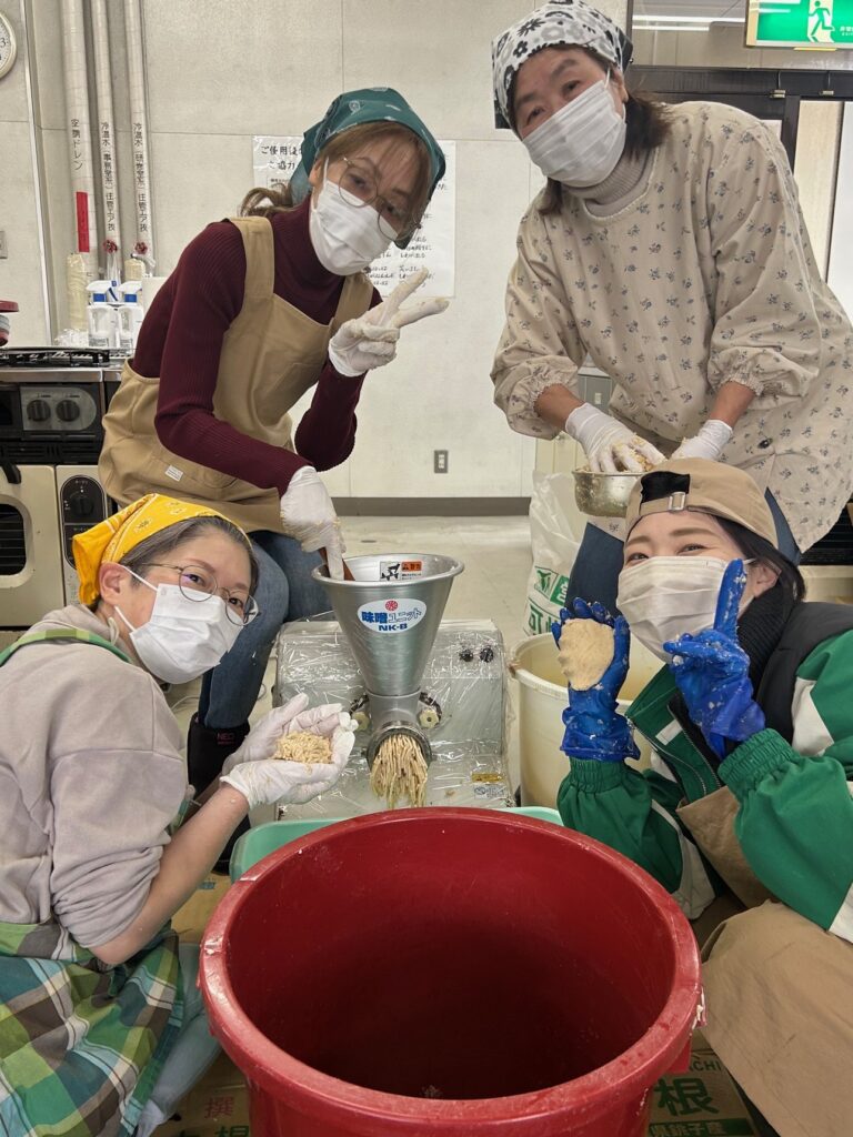 今年度は2月25日から3月6日までに6回実施し、約100人が参加。厚生産業株式会社を講師に、合計約1725㌔のみそを仕込みました。