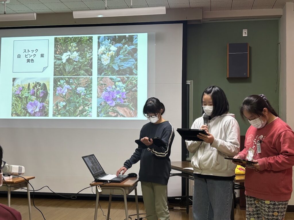 町特産の花や「カラフルおにぎりと小さな畑プロジェクト」について発表した農業グループの児童